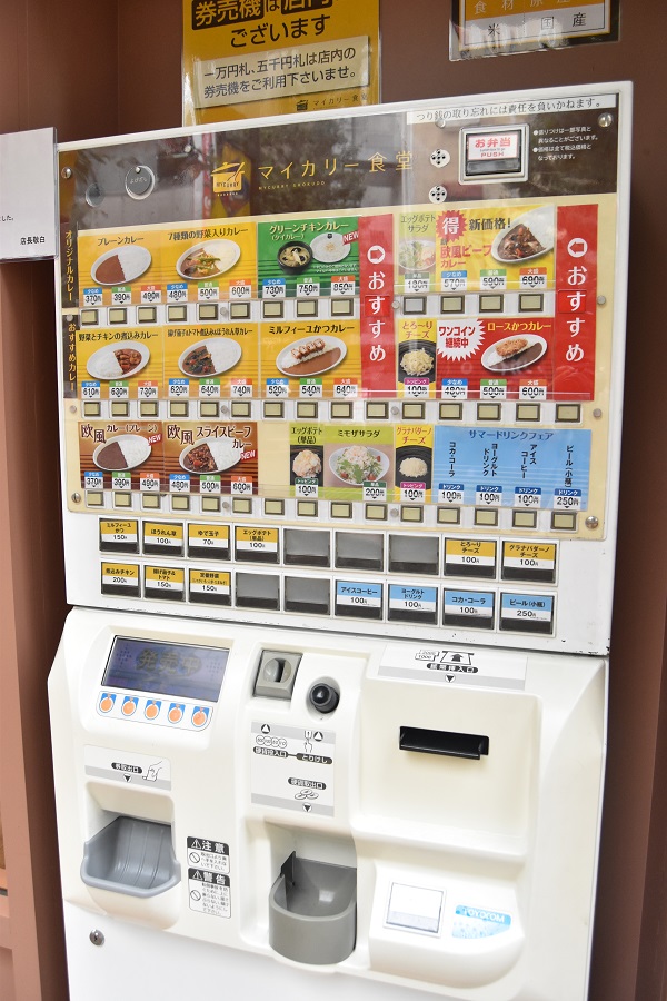 食券機は松屋と同じ機械を使っている様子。今回は欧風ビーフカレー(税込590円)にトッピングで揚げなす&トマト(税込150円)とほうれん草(税込100円)を注文してみた。