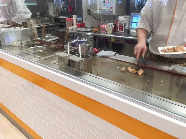 ビーフステーキやチキンステーキは、レジ横の鉄板で調理する様子が確認できる。じゅんわり焼いている姿を見ると、食欲が増してくる。折角なので、吉野家で贅沢したい! ということで「ビーフステーキセット」(950円)を注文した。