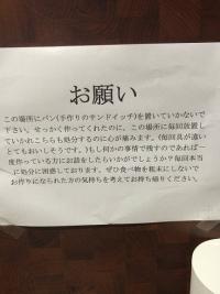 「この場所にパン(手作りのサンドイッチ)を置いていかないでください。せっかく作ってくれたのに、この場所に毎回放置していかれこちらも処分するのに心が痛みます。(毎回具が違いとてもおいしそうです。)もし何かの事情で残すのであれば一度作っている方にお話をしたらいかがでしょうか? 毎回本当に処分に困惑しております。ぜひ食べ物を粗末にしないでお作りになられた方の気持ちを考えてお持ち帰りください。」