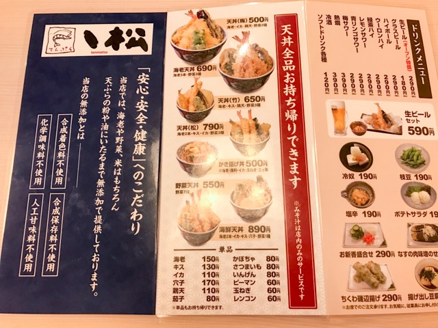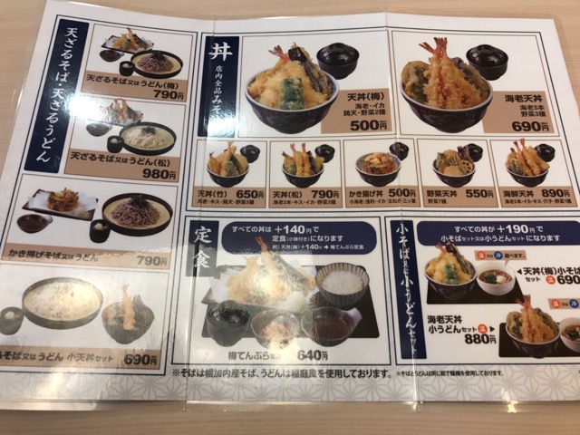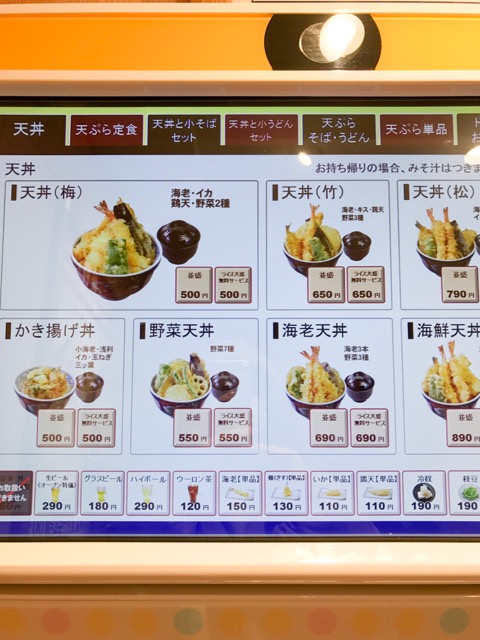 天丼のメニューは全部で7種類。一番高いのは「海鮮天丼」で890円。1000円以内で食べられちゃいます。+140円で定食、+190円で小そば、小うどんのセットにもできるようです。