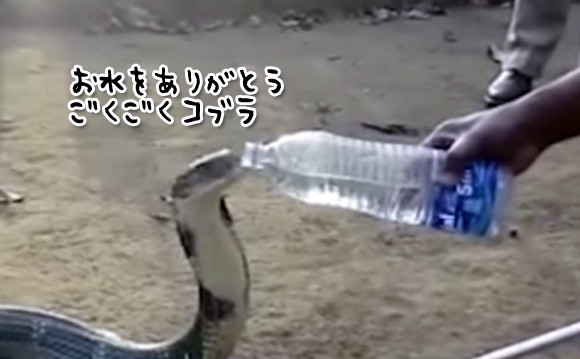なんとキングコブラはペットボトルから水を飲んだのだ。なりふり構っていられないほどのどが渇いていたのだろう。普段なら警戒する人間から直接手渡しに近い状態で水を飲むなどめったにないことだ。