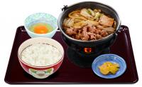 同メニューは、「牛すき鍋」、たまご、ごはん(並盛)、つぼ漬けをセットにした定食。2014年2月~3月に販売した人気の定食が再登場する。「牛すき鍋」は、牛肉、白菜、玉ねぎ、長ねぎ、豆腐、うどんを甘い味付けの割下で煮込んだもの。