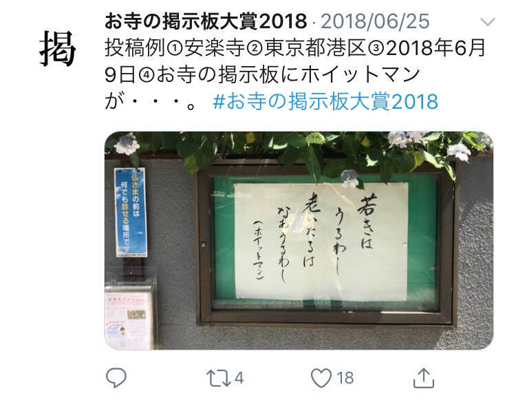 「お寺の掲示板にはそのお寺の住職のセンスが出ます。普通の文面でもお寺で掲示されることにより、趣が出ることもあります。投稿する際に『#お寺の掲示板大賞2018』というハッシュタグを付けることで手軽に検索ができて、大きな予算もかからない。そのため今年4月の企画発案から今夏の実現まで、すぐにこぎつけられました」(同)