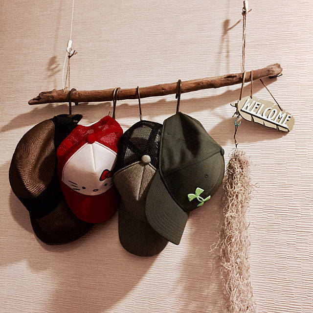 tomoyuzupiさんは玄関のピクチャーレールに流木を吊るして、帽子をかけられる場所を確保しました。ピクチャーレールを、収納アイテムとして活用するのはグッドアイディアですね。そして流木やエアプランツで自然を感じられるのも魅力的。お家に帰ると、こちらのスペースでホッと心が暖まりそうです。