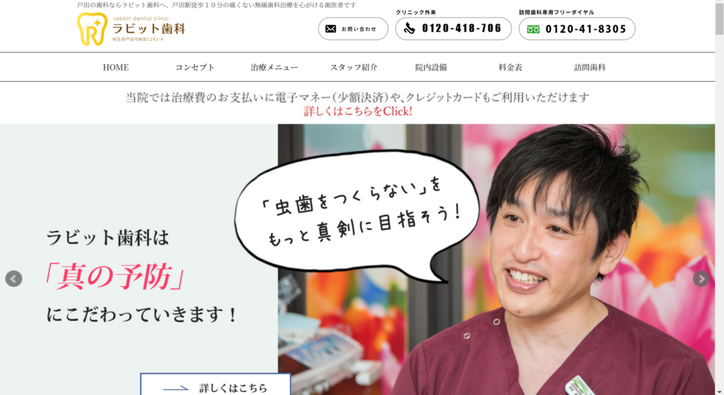 ラビット歯科はJR埼京線 戸田駅西口より徒歩10分の場所にある歯科医院です。医院の前に専用駐車場が3台と専用駐輪場があります。お車または自転車でも来院することが可能です。