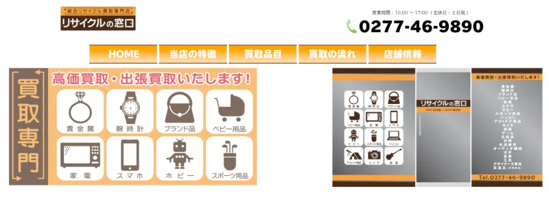![]() リサイクルの窓口(1店舗) | ・桐生市末広町 | ・現物を確認して査定 | ・店頭買取 ・出張買取 | ・ブランド品のほか多彩な品目を取り扱い ・生前整理や遺品整理も対応可能 ・値段が付かないものは無料引き取りOK ・駅チカでアクセス良好 | 公式HP |
