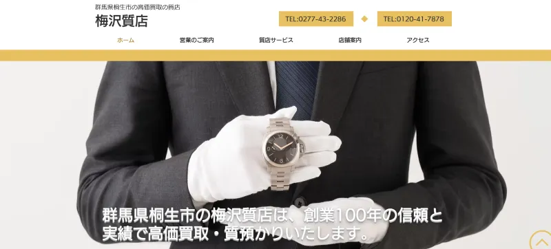 ![]() 梅沢質店(1店舗) | ・桐生市本町 | ・現物を確認して査定 | ・店頭買取 | ・創業100年の歴史をもつ老舗質店 ・買取、質預かりの両方に対応 ・経験豊富な査定士が丁寧に査定 ・地元で長年愛されてきた信頼の買取店 | 公式HP |