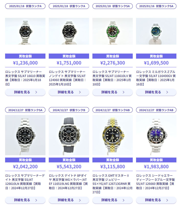 デイトナやサブマリーナ、ヨットマスター、デイトジャストなど様々なモデルの買取実績があることが分かります。