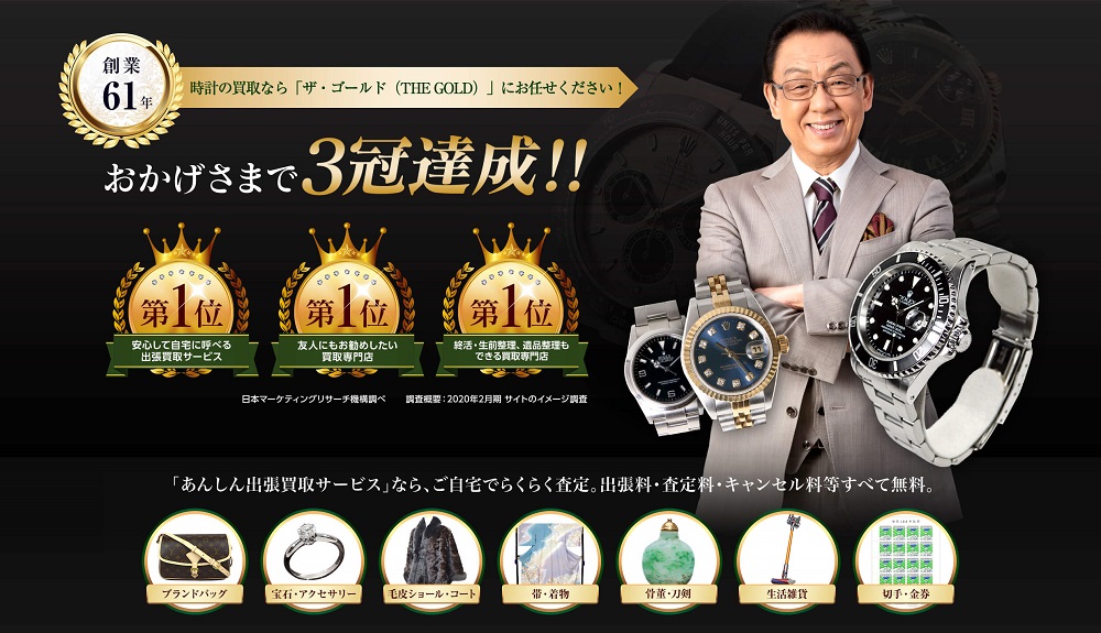 ザ・ゴールドは全国に100店舗近い店舗を運営する大手買取店で、ロレックス以外にもブランド品や着物、切手、古銭などの買取を行っています。