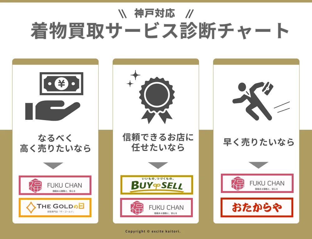神戸市内では20社以上の買取サービスが利用可能ですが、どのような点を重要視するかによって、選ぶべき買取業者が変わってきます。以下に診断チャートを用意したのでぜひご活用ください。
