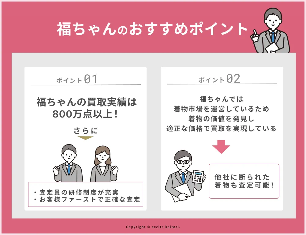 福ちゃんは、大阪を拠点とした総合買取企業として知名度の高いサービスです。買取実績は累計800万点以上と申し分なし。全国規模での無料出張買取を展開しており、特に着物の買取には特化しているため、高額査定が大いに期待できるでしょう。