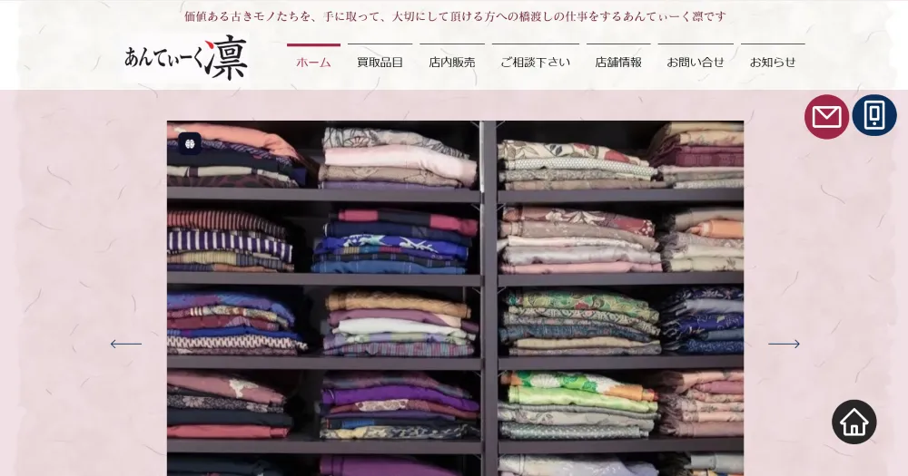 あんてぃーく凛(1店舗) | ・店頭持ち込み ・出張 | ・店頭買取 ・出張買取 | ・リサイクル着物やアンティーク着物の販売・買取を行っている ・確かな知識を持つ査定士が査定 ・出張買取を希望する場合は事前に店舗へ確認の連絡をするのがおすすめ | 公式HP |