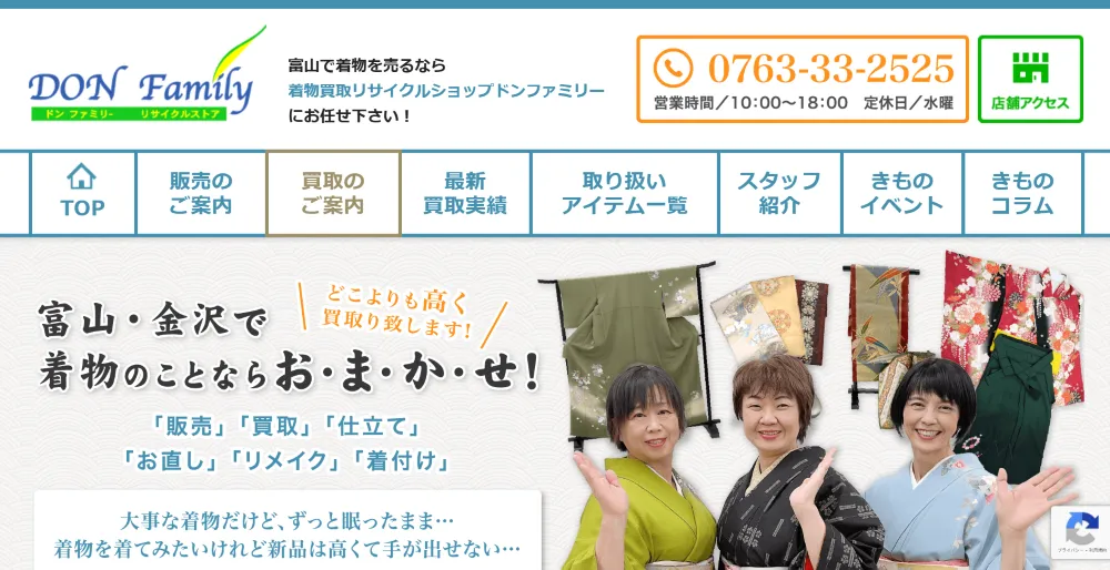 DONファミリーリサイクルストア(1店舗) | ・店頭持ち込み | ・店頭買取 | ・着物専門店 ・「どこよりも高く買取いたします」と謳っている ・着物関連ならどんなものでも買取OK ・店舗買取のみだが買取の質が高い | 公式HP |