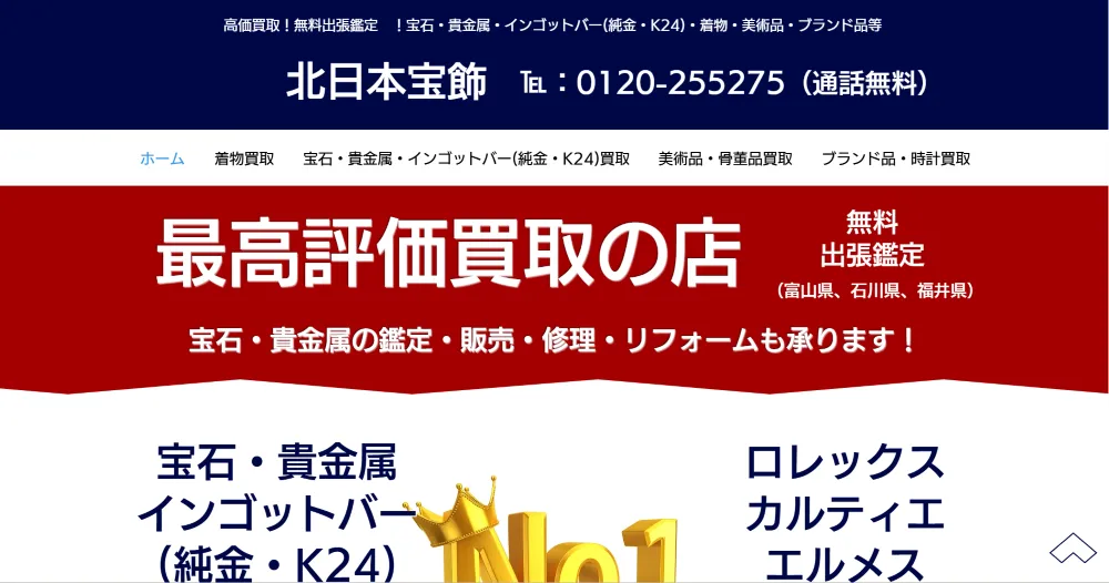 北日本宝飾(1店舗) | ・店頭持ち込み ・郵送 | ・店頭買取 ・郵送買取 | ・様々な買取を行っている中でも着物の買取に力を入れている ・買取商品は店頭販売せず、日本で最大級の専門のオークションで現金化 ・売れ残りリスクがないため最大還元が可能 | 公式HP |