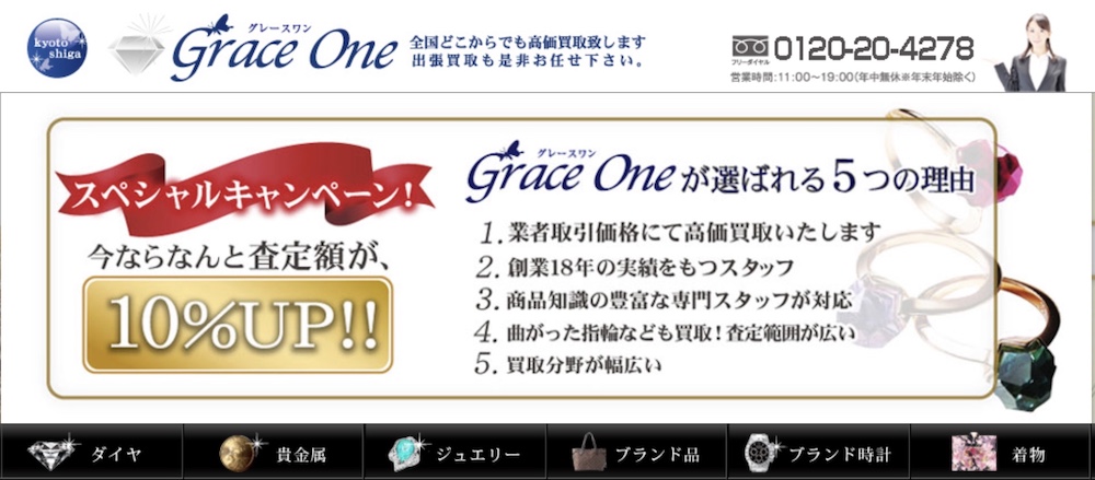 ![]() グレースワン(1店舗) | ・店頭持ち込み ・出張 ・宅配 | ・持込買取 ・出張買取 ・宅配買取 | ・業者取引価格で高価買取、査定料や手数料も無料 ・創業18年以上の実績と専門スタッフによる丁寧査定 ・全商品を自社販売のため中間マージンもなし、幅広い品目が対象 | 公式HP |