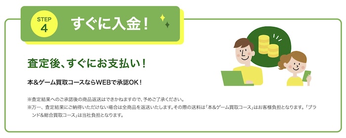 | 手数料 | 送料・集荷費用無料、査定料無料、振込手数料無料(ただし「本&ゲームコース」の返送料は顧客負担となる場合あり) |