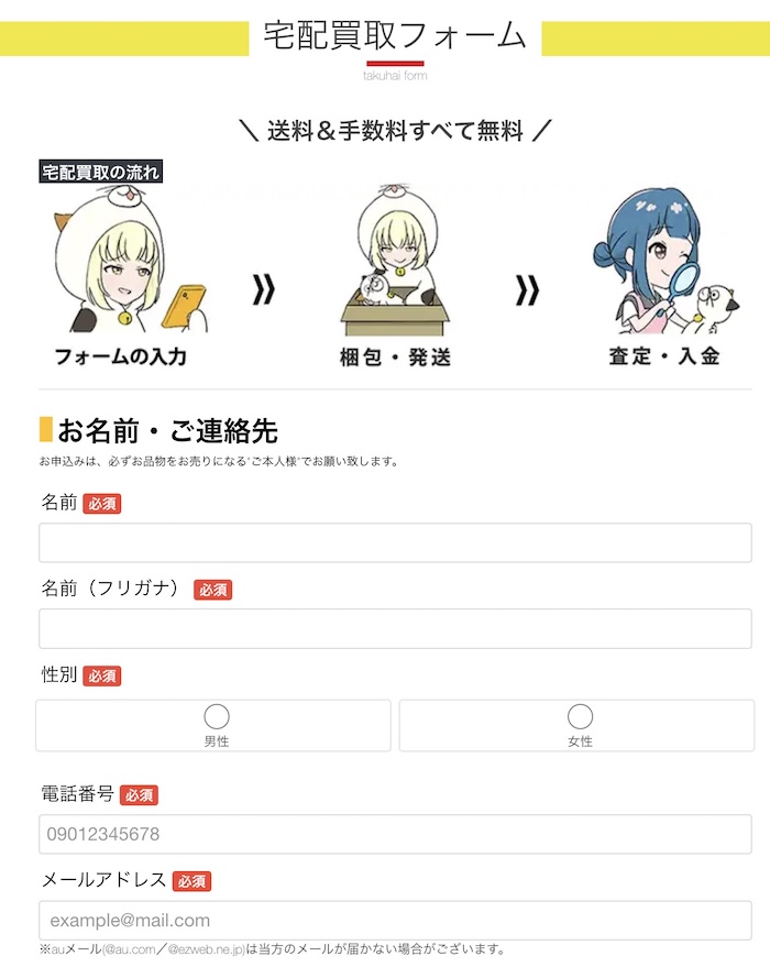 公式サイトの申込フォームから、必要情報を入力して宅配買取を申し込みます。