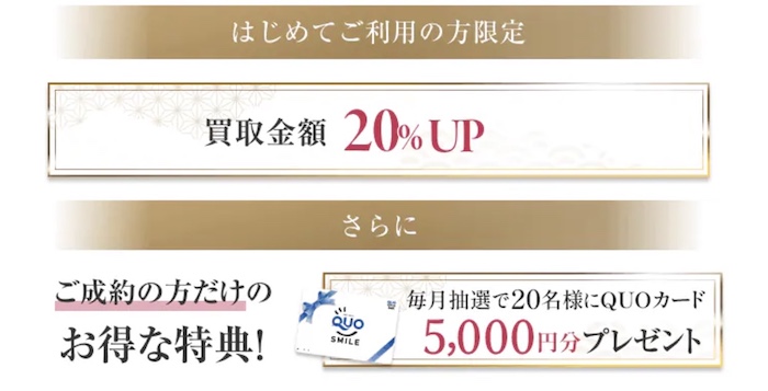 買取方法は、店頭買取・宅配買取・出張買取の3種類に対応していて、ご自分に合った方法を選べます。公式サイトでは現在(※)、出張買取限定で買取価格10%UPキャンペーンが行われているので、気になった方はチェックしてみましょう。(※2024年10月)