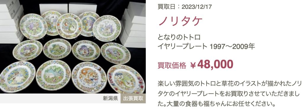 大人から子どもまで世代を超えて愛される「となりのトトロ」の世界観が艶やかで透光性に優れたボーンチャイナで表現されており、アニメファンを中心に高い人気があり、中古品も高額で取引されています。