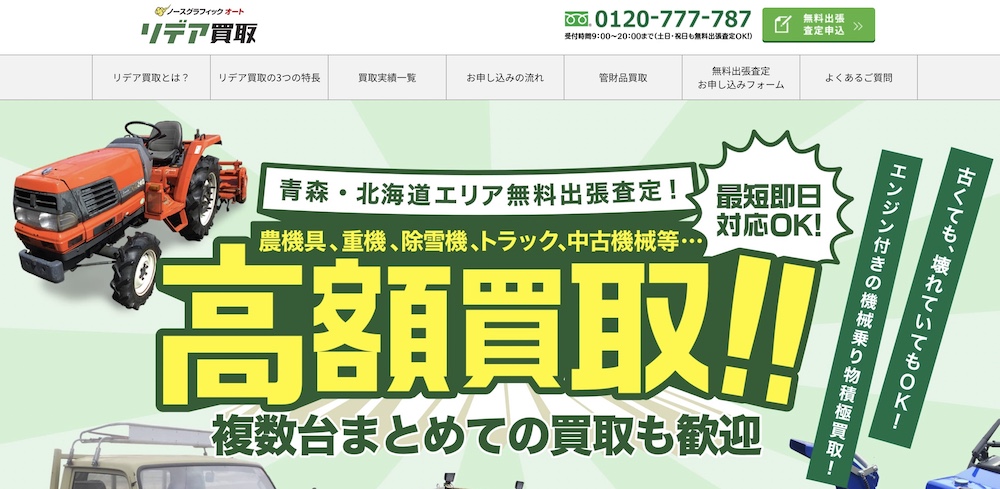 北海道に根付いて20年以上、地域密着で事業を展開しているリデア買取は、トラックに加え、重機や農機具など幅広い車両の買取に対応しているのが特徴です。