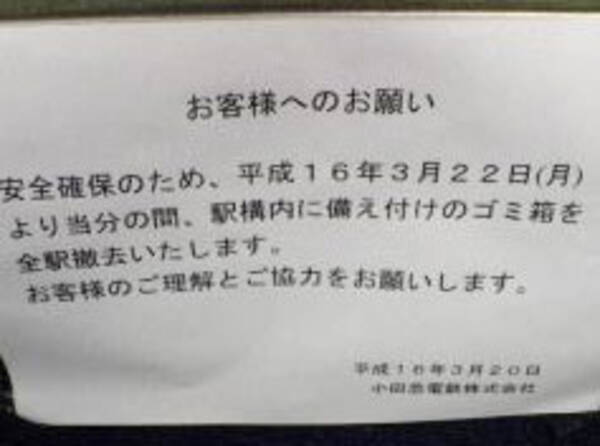 「実は先週、国土交通省から各鉄道会社に対してテロ対策のための自主警備徹底を依頼する通達があったのです。特にゴミ箱を撤去という指示があったわけではありませんが、小田急としてできる処置を迅速に行ったということになります。駅構内だけでなく、現在は特急ロマンスカー内のゴミ箱も利用できない状況にさせていただいております」