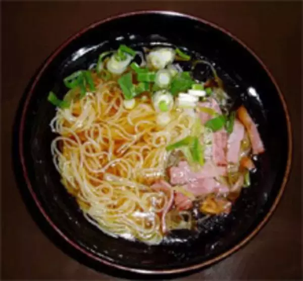 ビニールのパッケージを開く。見た目は普通の丸い細麺。熱湯で茹でて冷水でしめ、ベーコン&ねぎを添え、友人K氏と一緒に食べてみた。うん、なかなか。K氏いわく「麺がしっかりしている」。つるつるしていて、こしがある。