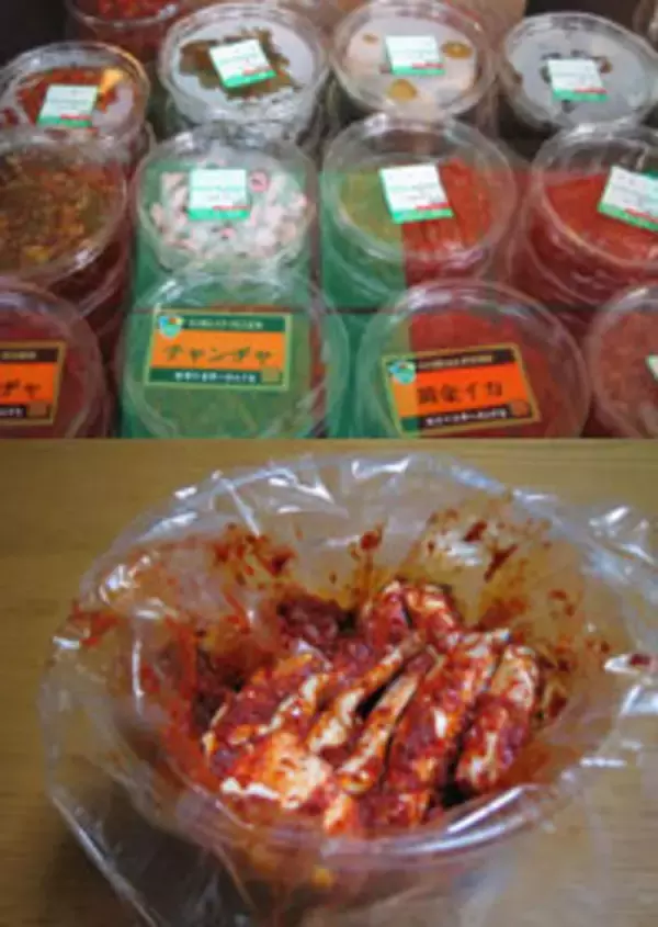 (上)キムチ横丁の店先には豊富なキムチ類が並ぶ。(下)カニキムチ!