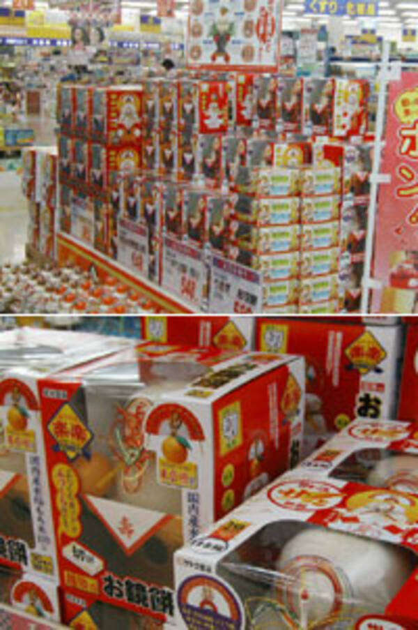 鏡餅がこれだけ早く店頭に登場するようになったのは鏡餅が上下一体パックになったことにもある。