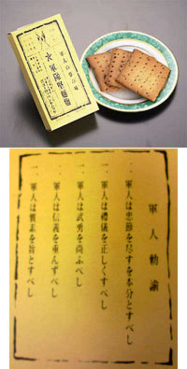 名前まで相当堅いこのパン、気になったので即、取り寄せてみた。パッケージはかなりレトロな雰囲気で、クリーム色の箱に、グレーの文字で漢字がならぶ。そして軍服に印刷してありそうな日の丸と星印。世界観はまさに軍隊。箱の裏面には「軍人直喩」なるものが書いてあった。『一、軍人は忠節を尽すを本分とすべし 一、軍人は禮儀を正しくすべし 一、軍人は……』と続く5か条。ふむふむ。