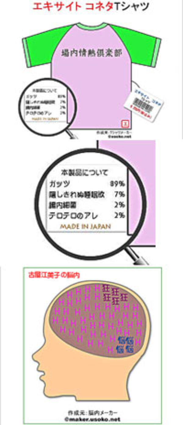 続いてTシャツメーカー。試しに「エキサイト コネタ」Tシャツを作ってみると、左図(上2枚)のような結果に。