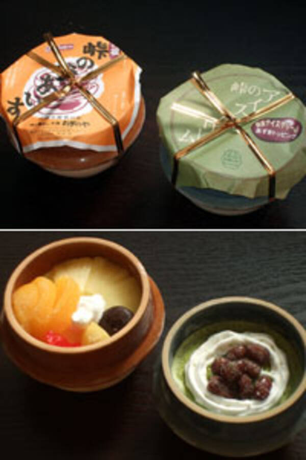 実はこのほかにも「峠のアイスクリーム」という商品もある。こちらは抹茶のアイスクリームの上に、クリームとあずきのトッピングがのった和テイスト。上品な抹茶の香りが漂い、控えめな甘さなのもいい。落ち着いたブルーを使った釜なので、2つセットで並べてみても面白い。