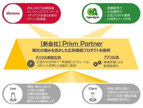 新会社による提供事業イメージドコモとサイバーエージェントは、今後、新会社Prism Partnerにおいて、広告商品の開発と広告主への販売を推進するとしている。