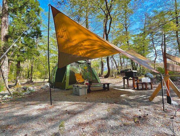 同じ敷地には、白馬塩の道温泉 倉下の湯があり、キャンプでのお風呂問題はこれで解決。倉下の湯カーステイも併設されているため、仲間や家族と集合し、白馬を楽しむ拠点としても利用できる。そして、特筆すべきは、北アルプスを一望できる抜群のロケーション。白馬三山と空の色が移り変わるのを眺めながらの時間は特別であるとしている。
