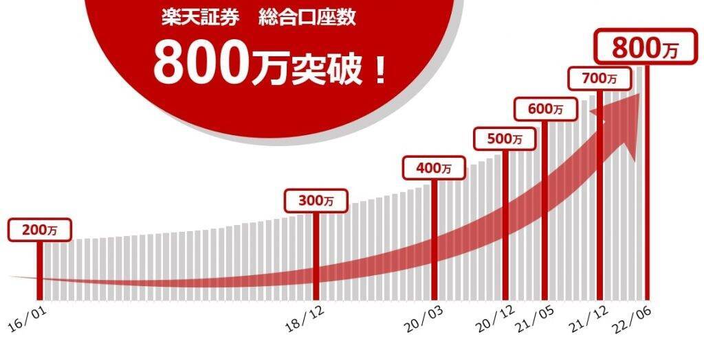 2022年6月からは、新たに事前入金の必要なく投信積立ができるオンライン電子マネー「楽天キャッシュ」決済の提供も開始し、これらの取組みの結果、2021年12月に証券総合口座数が700万口座に到達してから約6カ月で100万口座増の800万口座を突破したとのことだ。