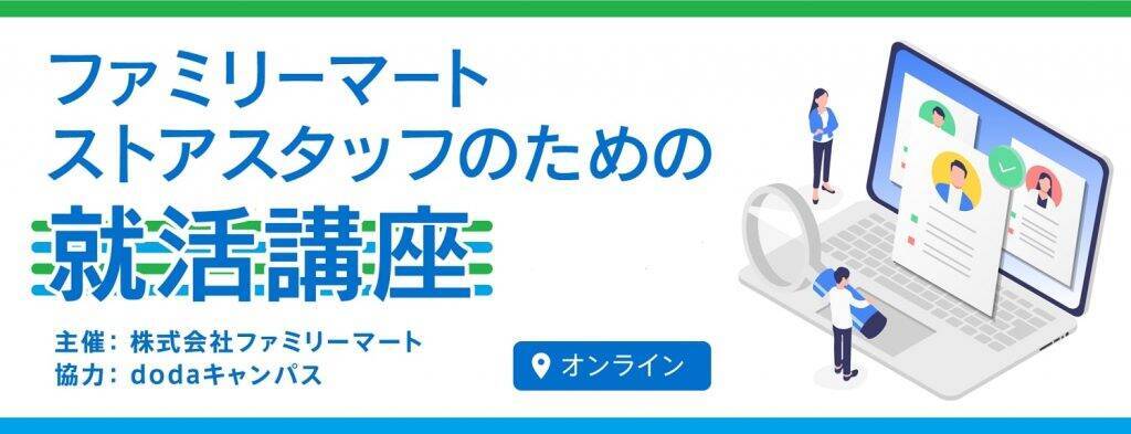 ファミリーマート、独自の就活支援オンライン講座を開催同オンライン講座は、就職活動に役立つ自己PRやエントリーシート作成等を中心に、ファミリーマート独自プログラムにて開催。