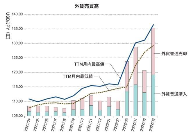 為替が円安に動いた3月のTTM月内最高値は123.44円、そして4月のTTM月内最高値は130.14円となり、3月から増加した売買高は4月に過去最高となった。その後、6月に20年ぶりの高値となる135円をつけると、4月に過去最高を記録した月間売買高を更新。2月比で5倍を超える売買高に。