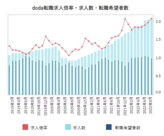 ●求人倍率2022年8月の転職求人倍率は、前月から+0.11ポイントの2.09倍となった。求人数は前月比101.8%、前年同月比149.1%。