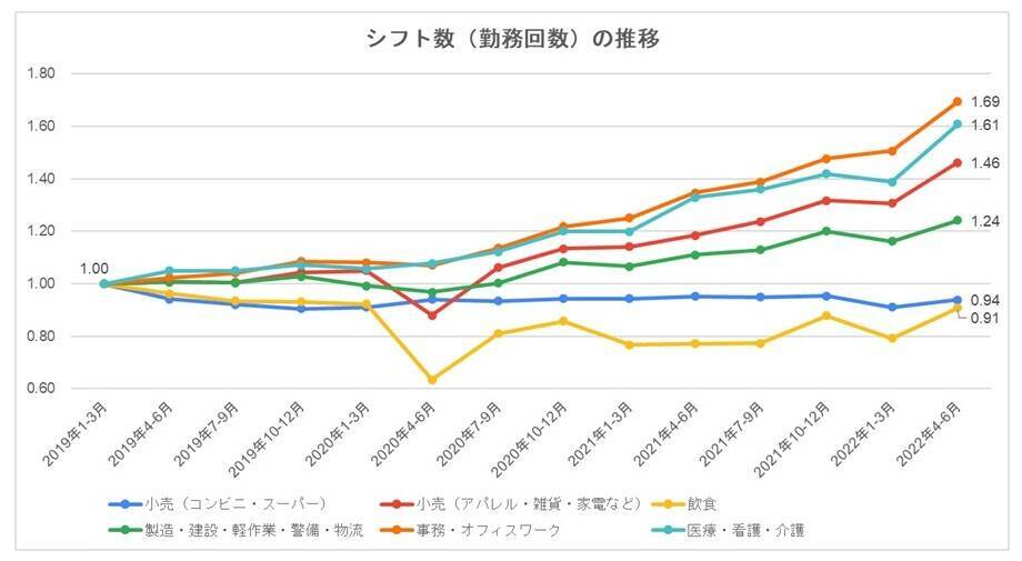 今回は、「小売(コンビニ・スーパー)」「小売(アパレル・雑貨・家電など)」「飲食」「製造・建設・軽作業・警備・物流」「事務・オフィスワーク」「医療・看護・介護」の6業種における、新型コロナウイルスの感染拡大前の2019年1月から2022年6月までの推移データを発表している。