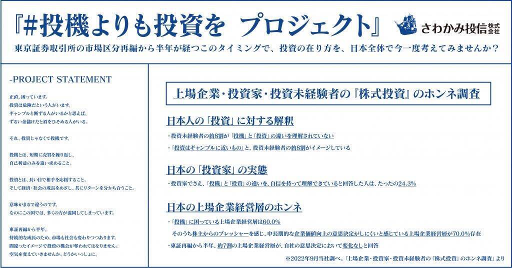 経済の先行きが見えにくく、不安なニュースが続く今、「投資」とは何かを日本全体で考えるきっかけを創造し、豊かな日本の未来を皆で築けるよう、同社は同プロジェクトを立ち上げたとのことだ。