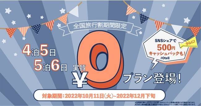 また、Otellを使って平日連泊を予約すると、一部宿泊施設での5泊6日と4泊5日が実質無料となる「実質¥0プラン」を全国旅行支援の期間に合わせて、10月11日より期間限定で提供するとのことだ。