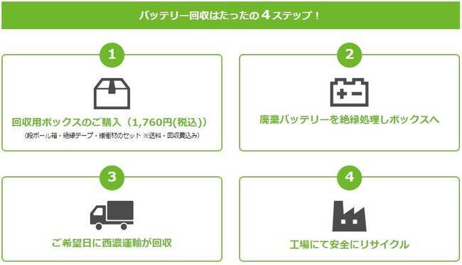 「廃棄バッテリー買取サービス」は、主に電動工具やハンディーターミナル、測量機、無線機など様々な機器に使用されている小型充電式バッテリーを対象とし、購入した専用の回収ボックスに不要な廃棄バッテリーを梱包し、それを回収・買取手配するサービスと。