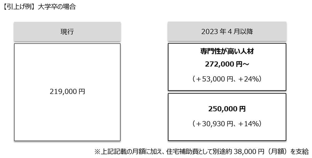 具体的には、例えば大学卒の標準的なケースで、従来から14%引上げ25万円とするという。