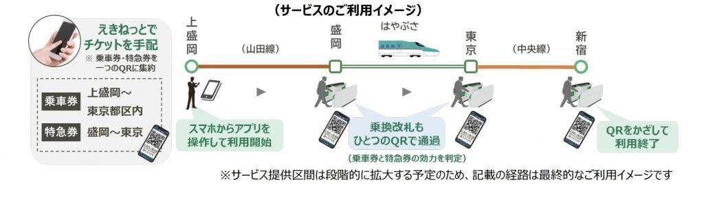 ・「えきねっと」で乗車券類を予約・購入する際に「QR乗車」を選択できるようになり、チケット購入後にえきねっとアプリに表示されるQRコードを自動改札機にかざすと、新幹線も在来線もチケットレスでシームレスに利用できる新たな乗車サービス。