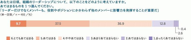 職場でのシェアド・リーダーシップの重要性について、考えを尋ねたところ、「とてもあてはまる(9.7%)」「あてはまる(37.5%)」「ややあてはまる(36.9%)」の合計は84.2%で、8割以上がシェアド・リーダーシップを重要だと回答した。シェアド・リーダーシップの重要性についての考え