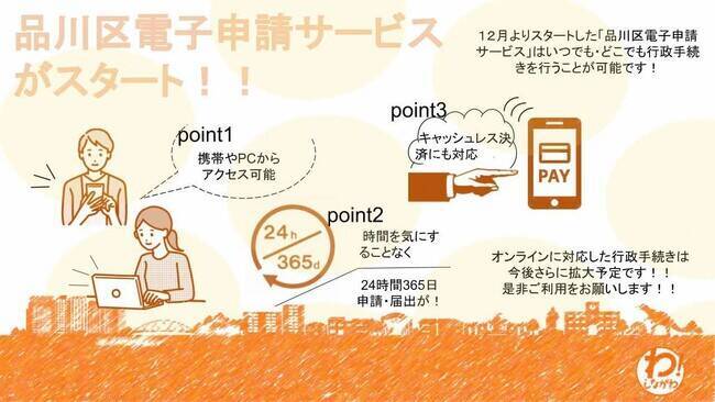 品川区は、オンラインによる「品川区電子申請サービス」を開始「品川区電子申請サービス」では、来庁することなく、24時間365日、PCやスマートフォンからネット上で行政手続きの申請・届出をすることが可能。
