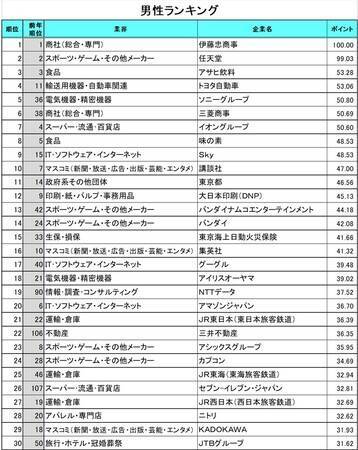 男性部門トップは、伊藤忠商事。2位は、「あつまれ どうぶつの森」がヒットした任天堂となった。また、任天堂を筆頭に、13位のバンダイナムコエンターテインメント、14位のバンダイなど、「スポーツ・ゲーム」が30位以内に5社がランクイン。
