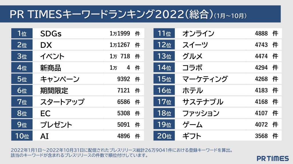 PR TIMESキーワードランキング2022(総合)では、キーワードが登録されたプレスリリース件数で2022年1月~10月の総合ランキングを集計。