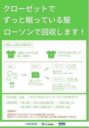 日販、返品物流を活用した古着のリサイクル事業の実証実験を開始同実証実験では、11月28日にオープンした「グリーンローソン(※)」(ローソン北大塚一丁目店)にて、不要となった洋服の回収BOXを設置し、集まった洋服をローソン店舗に配送される商品の返品物流に乗せて回収。