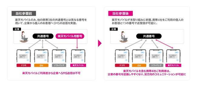 楽天モバイルは、同参画に基づき共通番号を導入することで、個人の利用客と企業間のSMSを用いたコミュニケーションの更なる効率化に貢献するとしている。