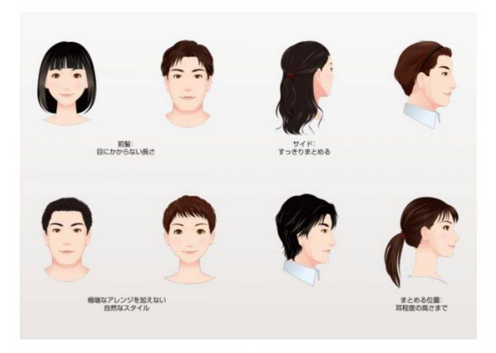 いつも手入れの行き届いた、清潔感がある自然なヘアースタイルに。お辞儀をしたときや、風が吹いたときなどでも、髪で顔が隠れないように整える。
